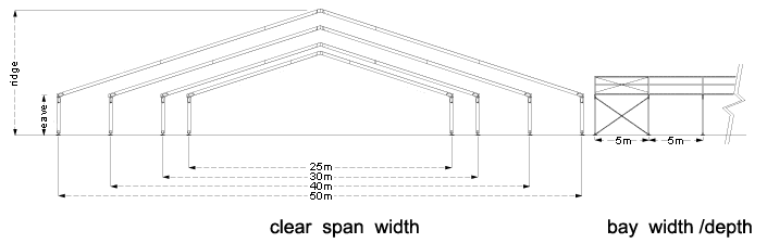 大型篷房的净跨(宽度)有25m,30m,40m 及 50m,长度以5m/组增加