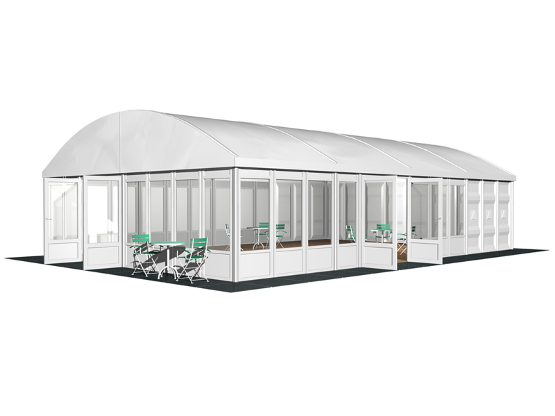 弧顶篷房设计坚固耐用,抗风速达100公里/小时(风载荷0.5千牛/平方米),拆装快捷方便,储运体积小。