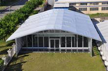 Arcum Tents are all made out of modular system, it can be extended by 5m bay without limit in length, frame out of reinforced alu alloy(6061/T6),fabric made out of double coated PVC,flame resistance is based on DIN4102 B1,M2 standard.